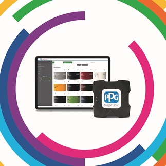 Conectividad inalámbrica: libere espacio en su sala de mezclas con PPG LINQ Color. El sistema permite a los usuarios comunicarse con sus espectrofotómetros de forma inalámbrica, así como conectarse a básculas sin necesidad de un PC a través de PPG MagicBox - un pequeño dispositivo que se conecta directamente a las básculas y recibe fórmulas de PPG LINQ Color.